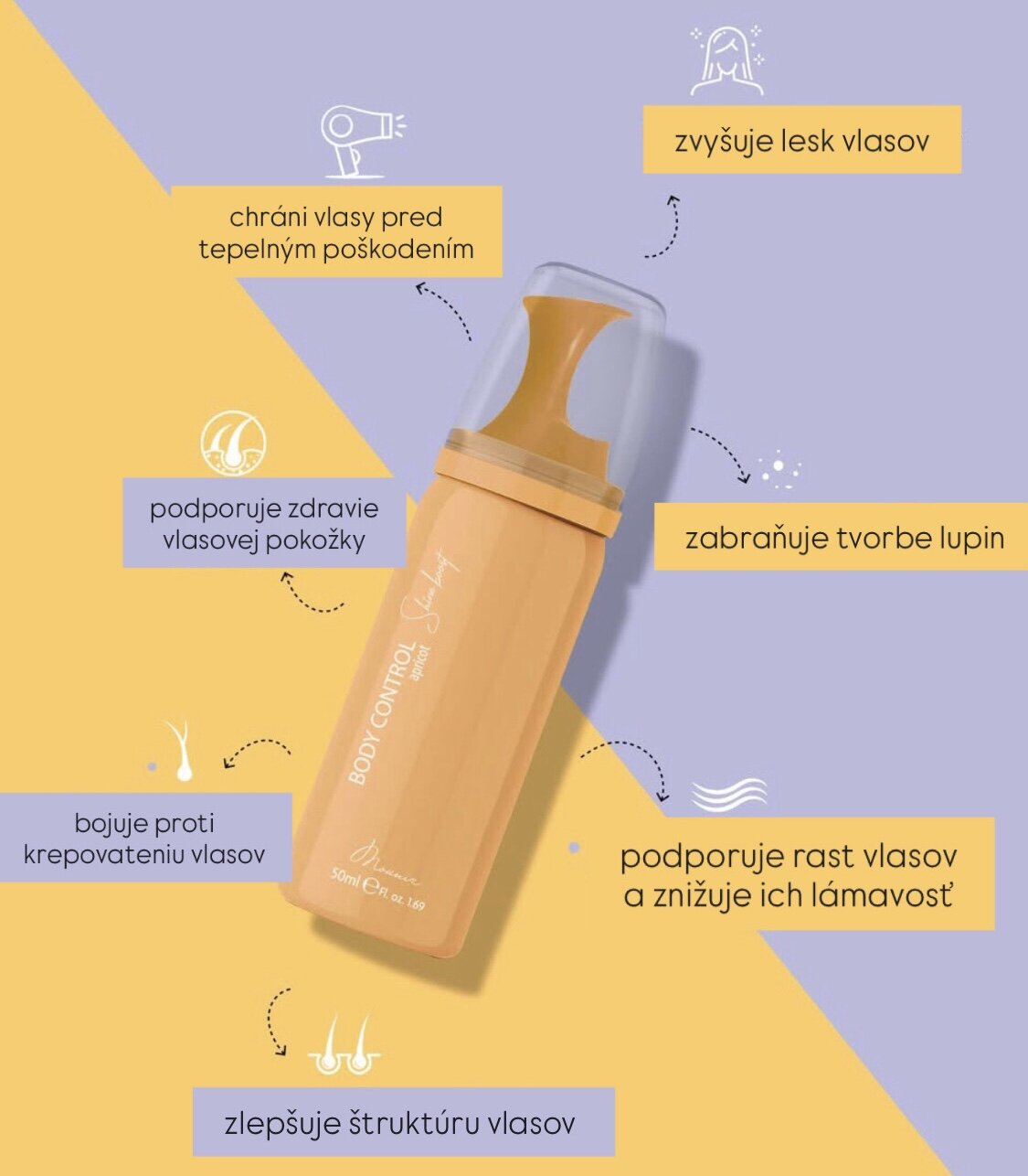 Táto novinka v podobe penového ošetrenia obsahuje tri typy olejov: sójový olej, olej z pšeničných klíčkov a slnečnicový olej. Všetky tieto oleje obsahujú vitamín E, životne dôležitú živinu pre udržanie zdravej pokožky hlavy. Vitamín E tiež zohráva kľúčovú úlohu pri posilňovaní a hydratácii vlasových korienkov, zvyšuje hustotu vlasov a chráni ich pred škodlivými účinkami slnečného tepla. Okrem toho táto liečba obsahuje degradovaný keratín, prírodný proteín, ktorý sa vyskytuje vo vlasoch. Tento prírodný proteín účinne minimalizuje krepovatenie vlasov, zachováva hrúbku vlasov a dodáva vlasom hladkosť a lesk. Ošetrenie "Shine Boost Body Control" od Mounir Products je dostupné v štyroch podmanivých farbách: akvamarínová, ružová, fialová a marhuľová.