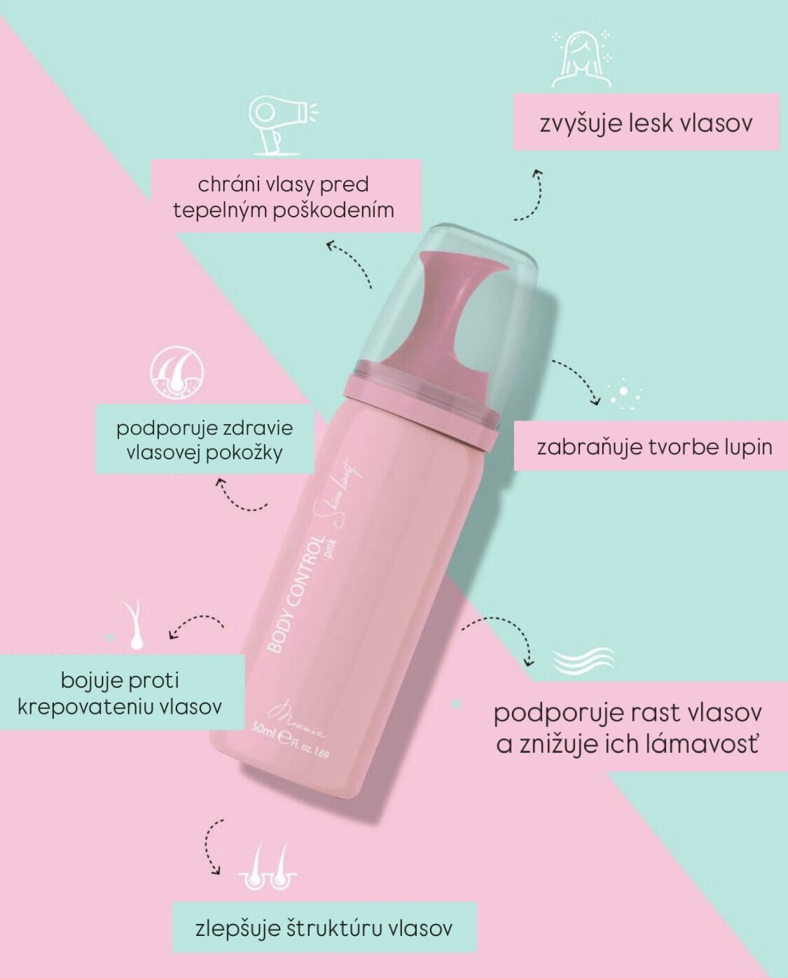 Táto novinka v podobe penového ošetrenia obsahuje tri typy olejov: sójový olej, olej z pšeničných klíčkov a slnečnicový olej. Všetky tieto oleje obsahujú vitamín E, životne dôležitú živinu pre udržanie zdravej pokožky hlavy. Vitamín E tiež zohráva kľúčovú úlohu pri posilňovaní a hydratácii vlasových korienkov, zvyšuje hustotu vlasov a chráni ich pred škodlivými účinkami slnečného tepla. Okrem toho táto liečba obsahuje degradovaný keratín, prírodný proteín, ktorý sa vyskytuje vo vlasoch. Tento prírodný proteín účinne minimalizuje krepovatenie vlasov, zachováva hrúbku vlasov a dodáva vlasom hladkosť a lesk. Ošetrenie "Shine Boost Body Control" od Mounir Products je dostupné v štyroch podmanivých farbách: akvamarínová, ružová, fialová a marhuľová.